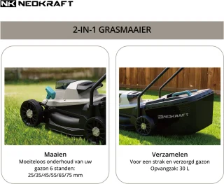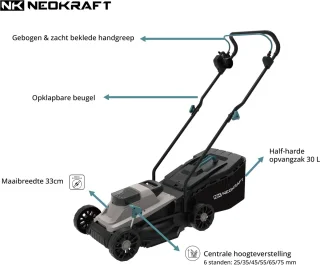 De NeoKraft maaier is niet zelfrijdend, maar door het lage gewicht en de ergonomische handgreep ervaar je minimaal fysiek belasting bij het maaien. Dankzij de centrale hoogteverstelling stel je in één beweging de gewenste maaihoogte in en met de 30L opvangbak houd je je tuin netjes zonder vaak te hoeven legen.