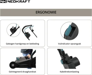 Niet elk instapmodel biedt comfort en slimme afwerking. De NeoKraft 1300W combineert kracht met doordachte details: een ergonomisch gebogen handvat met softgrip, centrale maaihoogteverstelling met 6 standen en een ruime 30 liter opvangbak die je eenvoudig leegt. Het resultaat: meer controle, minder inspanning en een netter gazon in minder tijd.